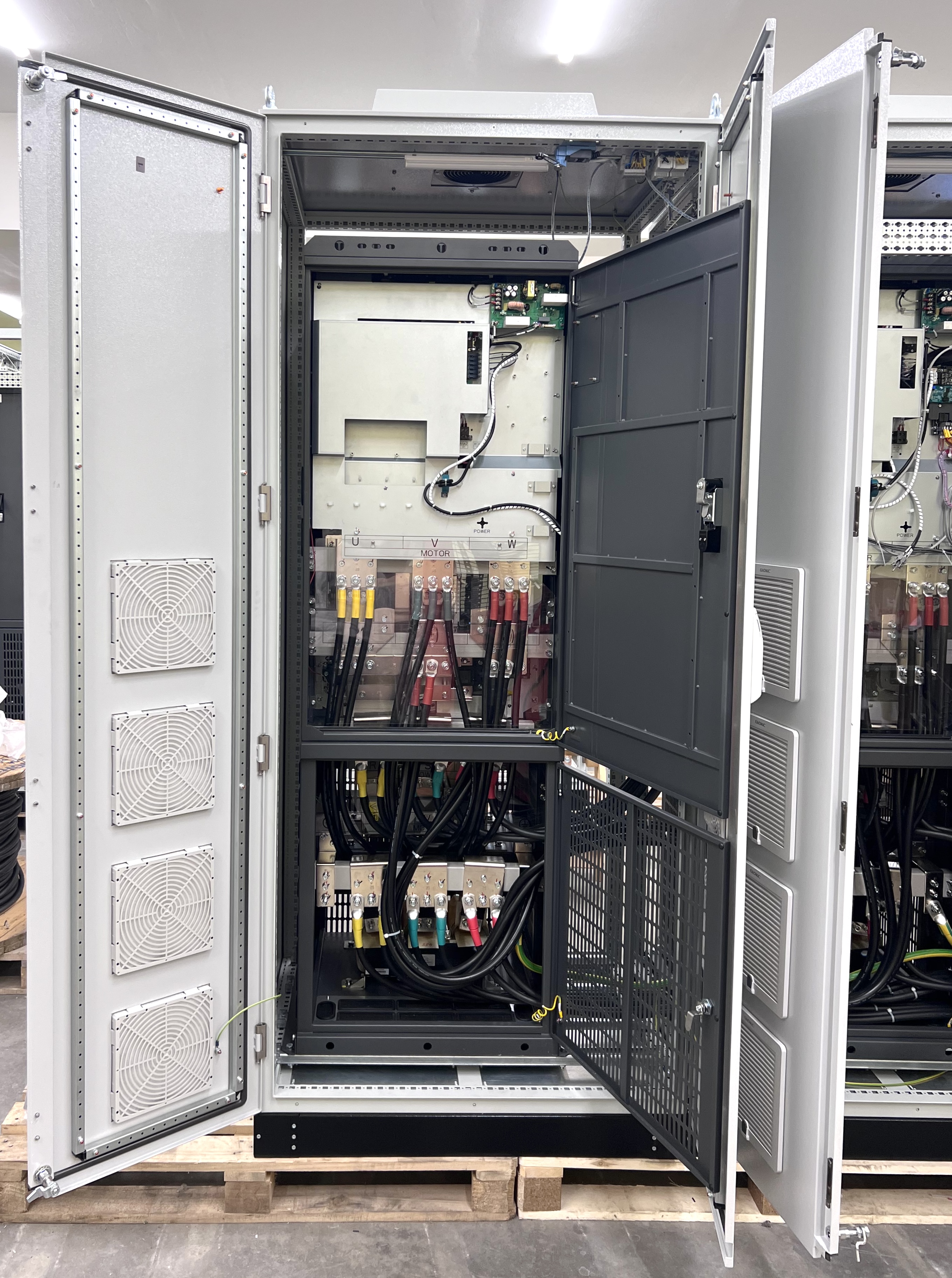 Используется для питания двух приводов ленты конвейера, мощность которых составляет 630 кВт. Шкаф изготовлен на базе двух частотных преобразователей Systeme Electric по 710 кВт. Ввиду большой мощности, конструктивно эти преобразователи частоты обладают слишком большой мощностью, поэтому их пришлось составить из двух модулей по 355 кВт. Модули взаимодействуют между собой через силовую связь по шине постоянного тока и через оптическую связь по управлению. Помимо этого, из-за серьезных массогабаритных показателей преобразователей частоты были применены усиленные конструкции для размещения их внутри щита, а также рассчитана и реализована эффективная система охлаждения. Данные модели шкафов укомплектованы воздушным автоматическим выключателем с электронным расцепителем.
