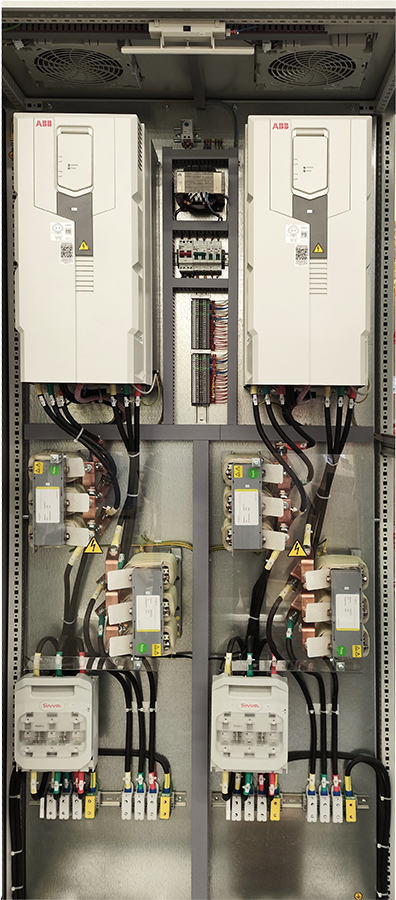 Базовыми элементами системы стали преобразователи частоты АВВ серии ACS580 в комплекте с быстродействующими предохранителями, а также сетевыми и моторными дросселями бренда Systeme Electric.